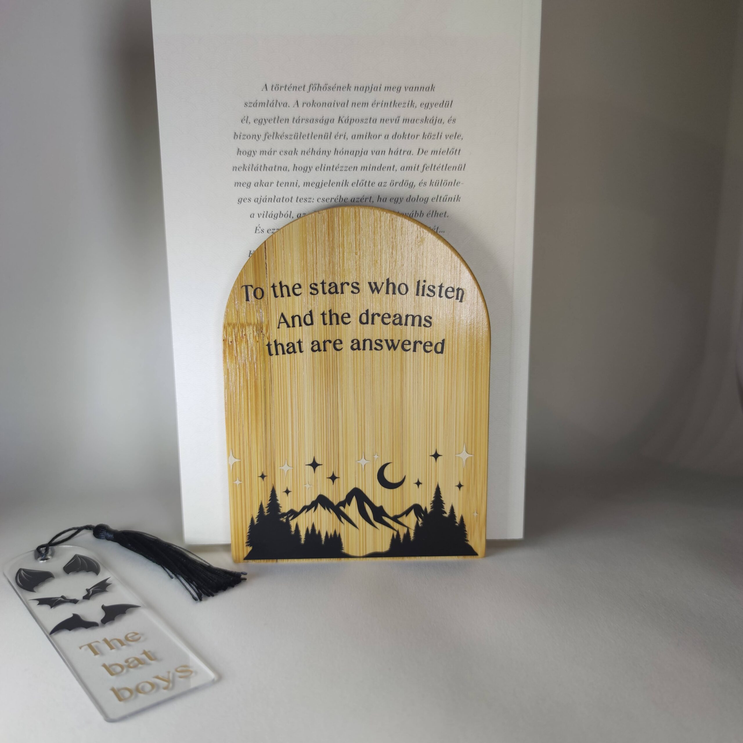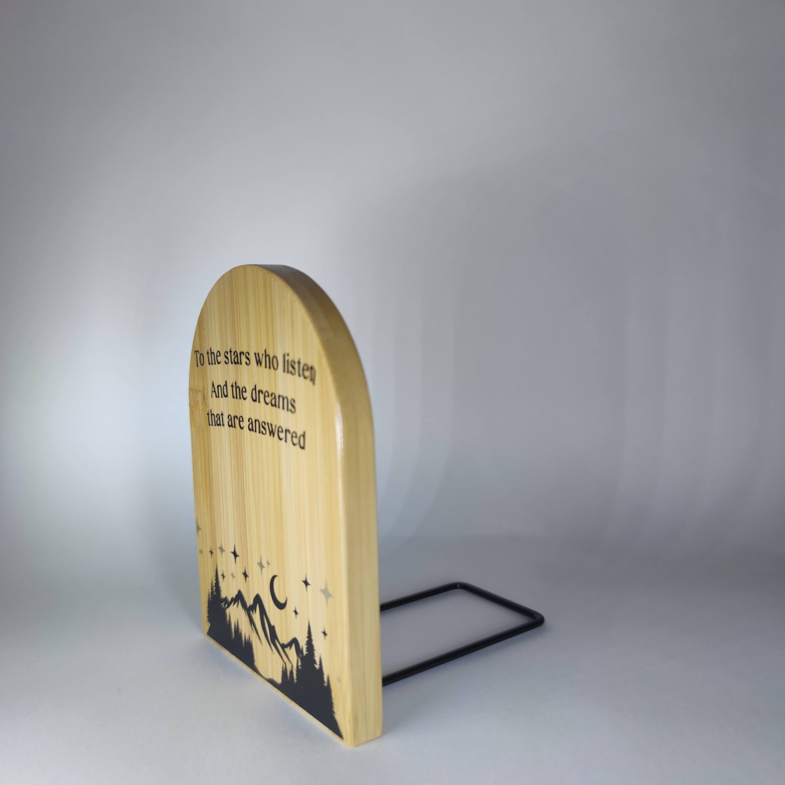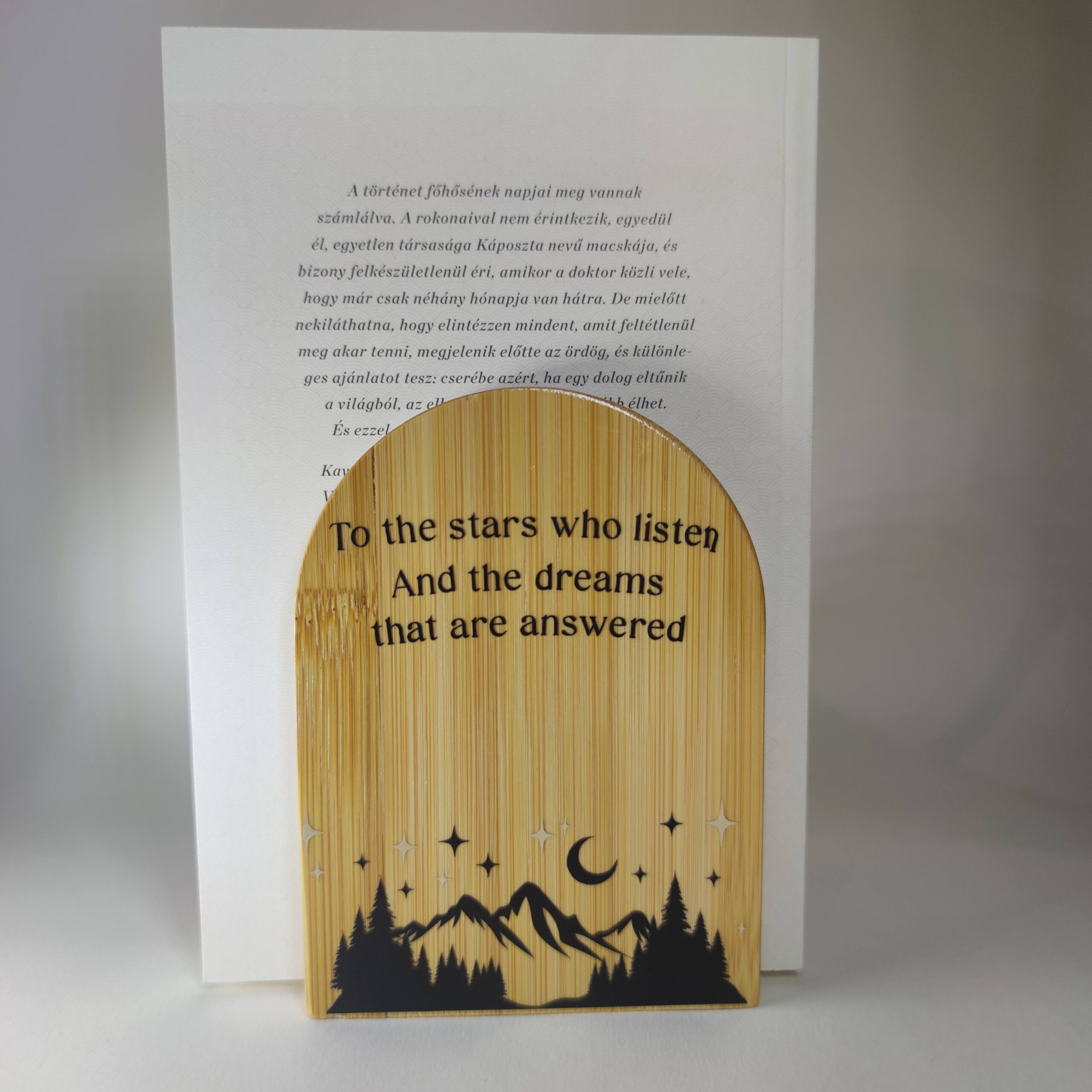 A fa hatású könyvtámasz Cricut géppel vágott, tartós fóliával készült.