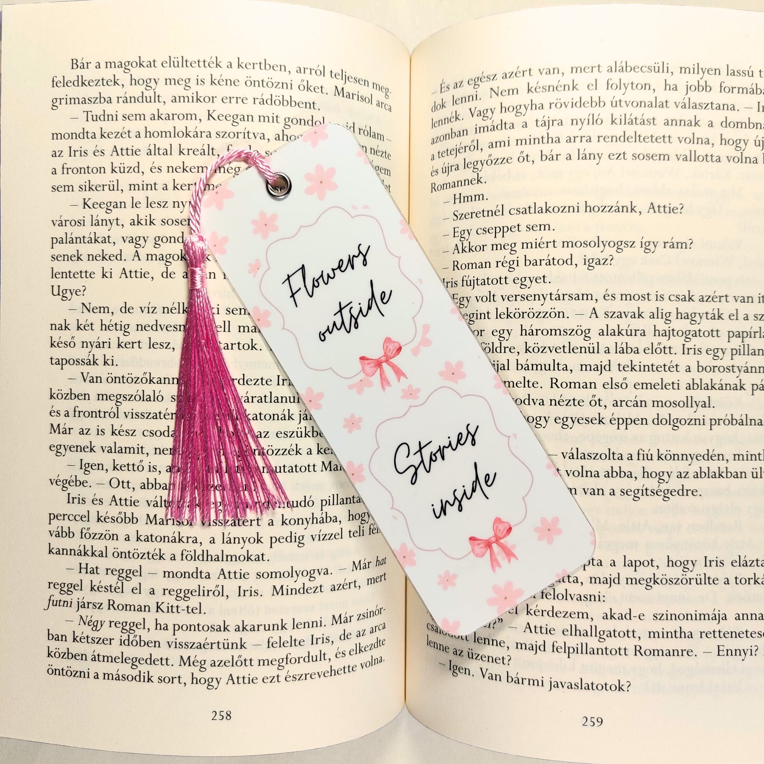 200 grammos papírból készült, laminált könyvjelző, rojttal és szegeccsel díszítve.