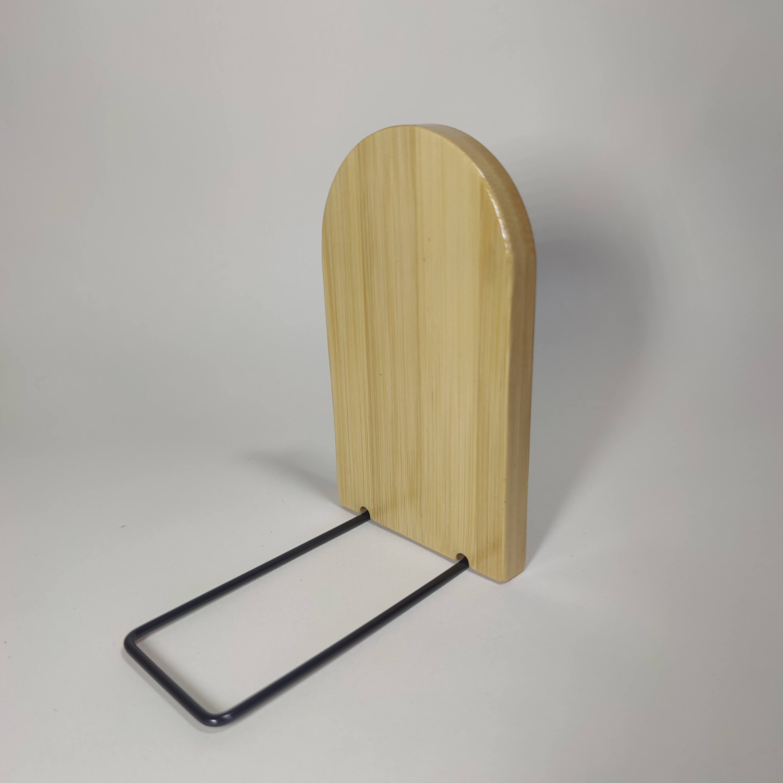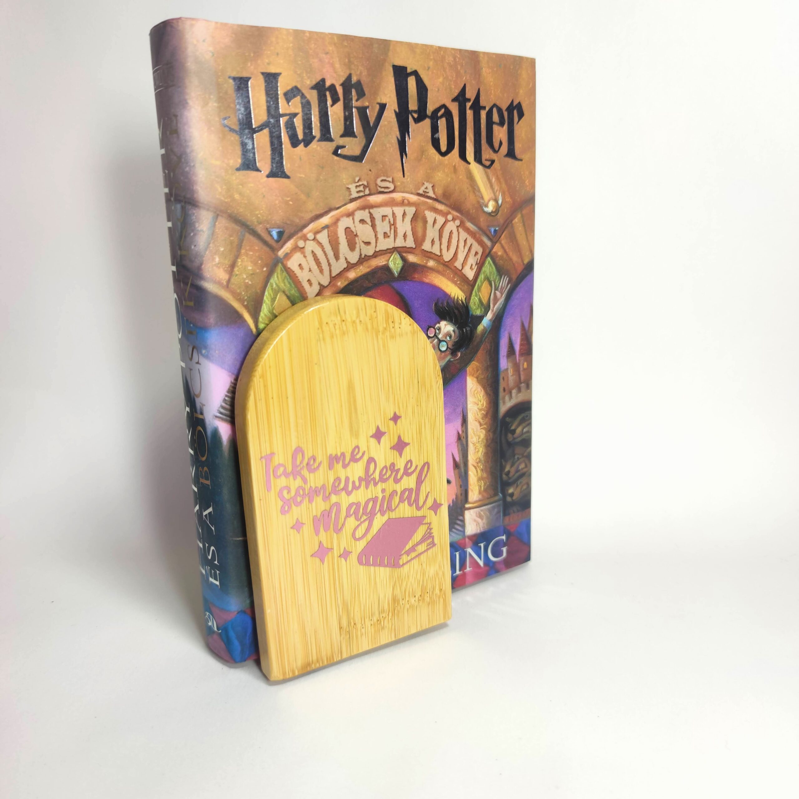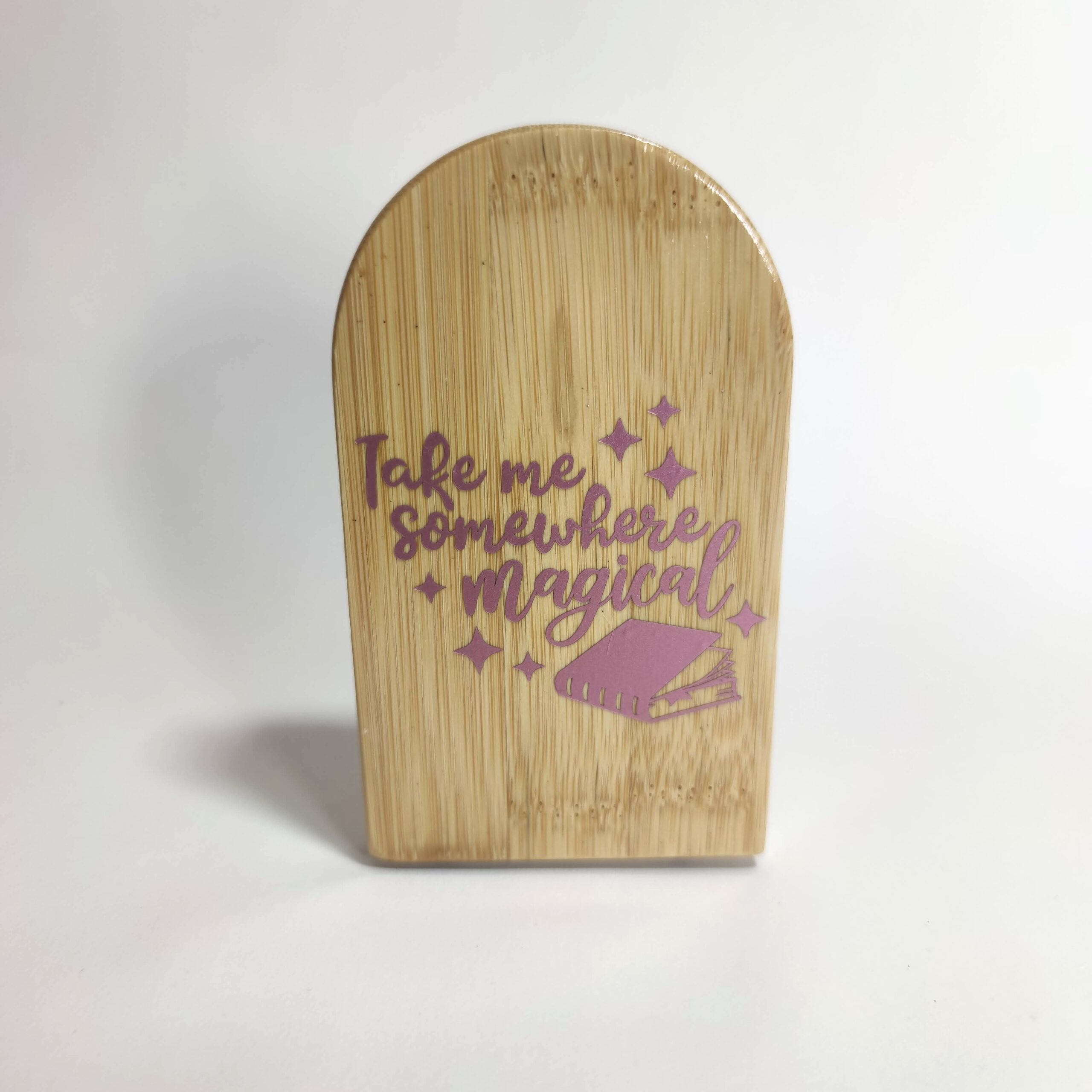 A fa hatású könyvtámasz Cricut géppel vágott, tartós fóliával készült.