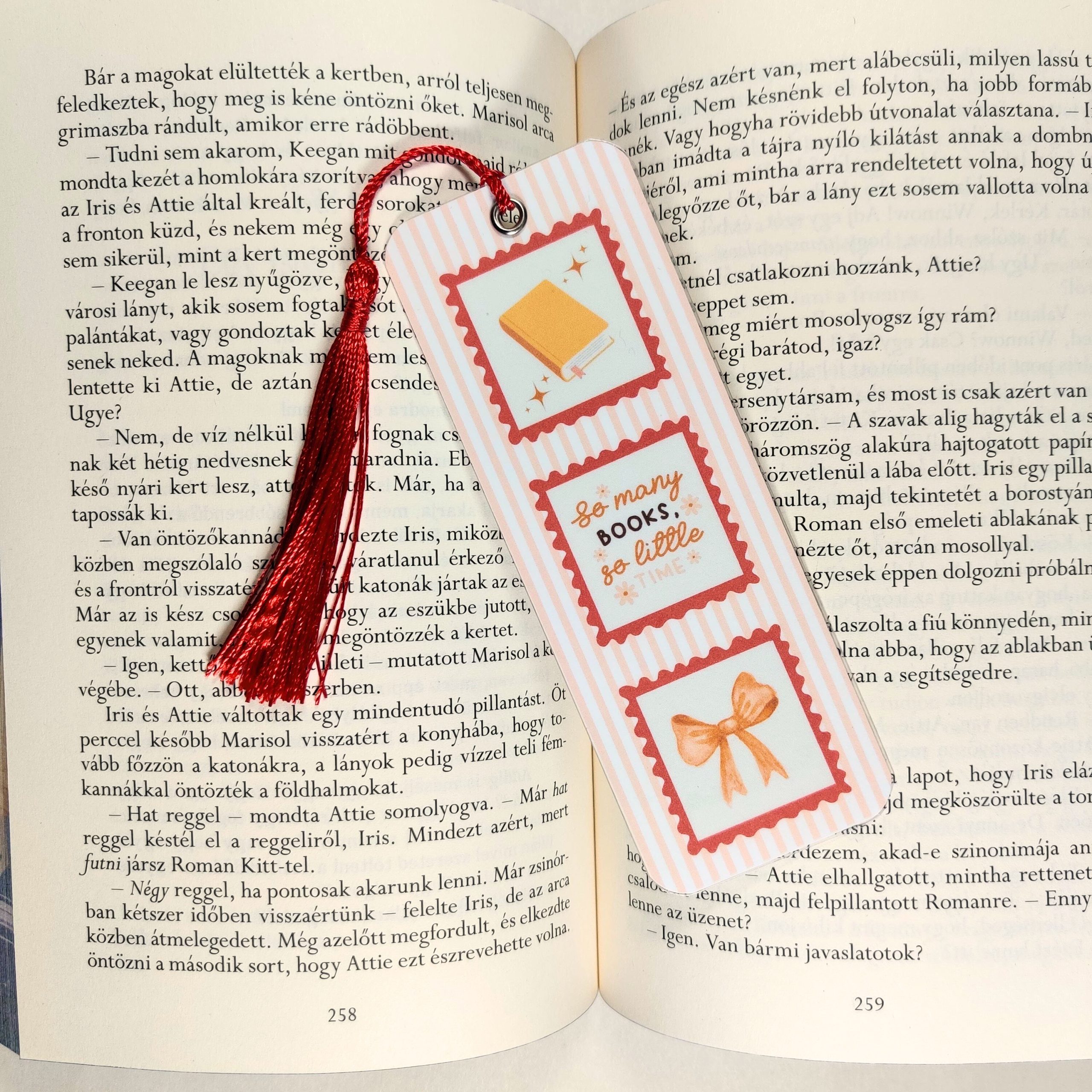 200 grammos papírból készült, laminált könyvjelző, rojttal és szegeccsel díszítve.