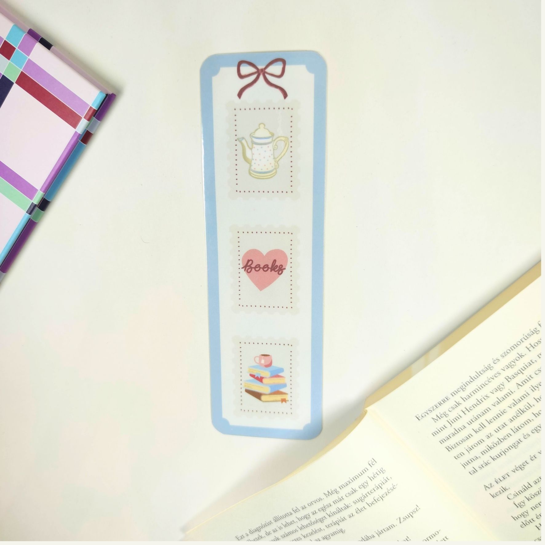 A könyvjelző egy oldalas, a hátoldalon márkajelzés található.